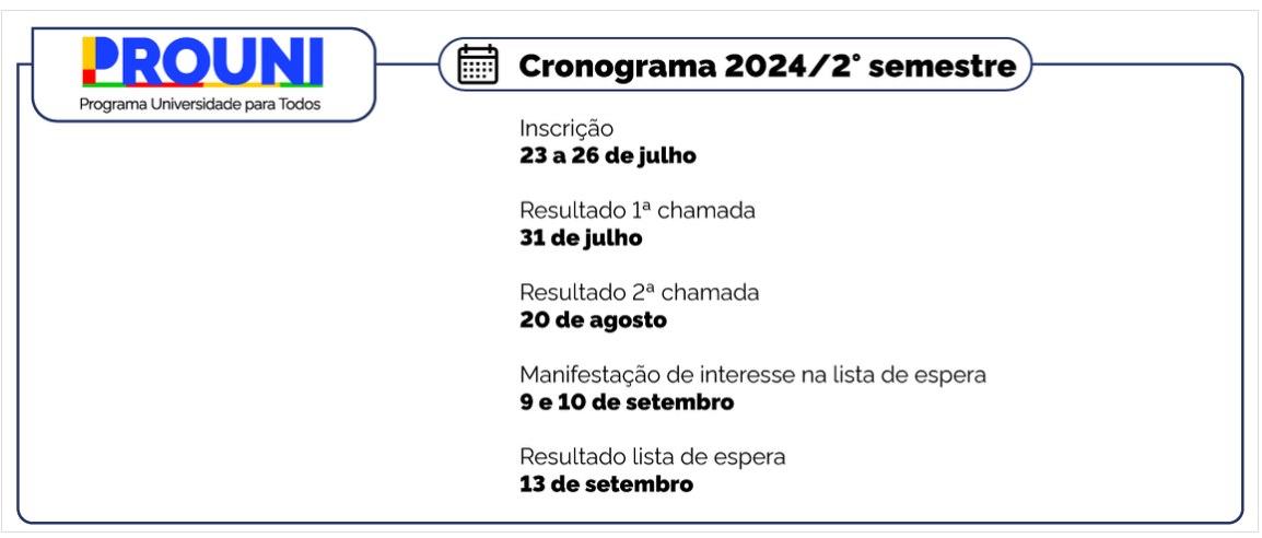 Resultado – O processo seletivo do segundo Prouni de 2024 será constituído por duas chamadas sucessivas. Os resultados com a lista dos candidatos pré-selecionados estarão disponíveis no Portal Único de Acesso em 31 de julho (primeira chamada) e 20 de agosto (segunda chamada) deste ano.