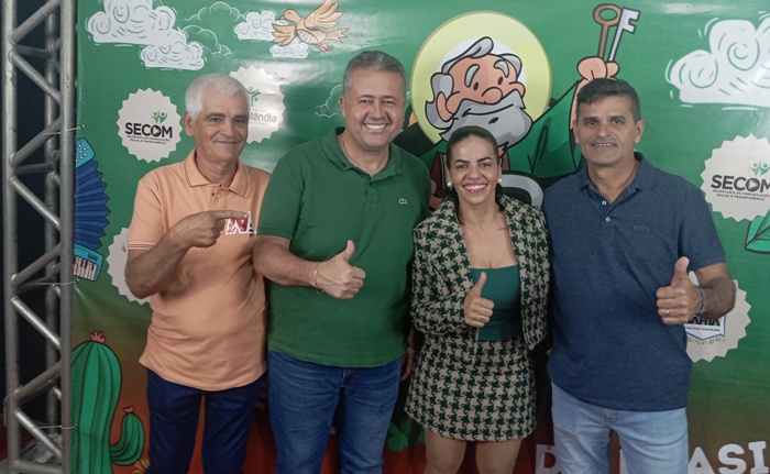 João Nilton “Pité” liderança dos movimentos sociais, deputado Alex da Piatã, Nayara de Dió vereadora e pré-candidata a prefeita apoiada por Vonte ao seu lado