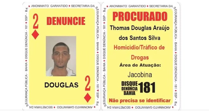 Segundo a Secretaria de Segurança Pública da Bahia (SSP-BA), Thomas Douglas Araújo dos Santos Silva, conhecido como “Patolino”, era o 2 de Ouros do Baralho do Crime, ferramenta que lista os criminosos mais procurados do estado.