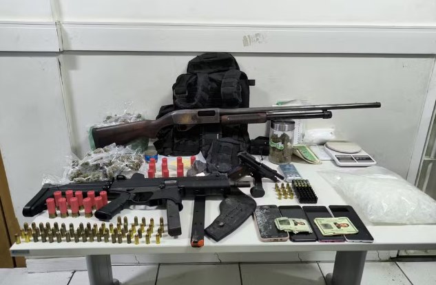 Com “Patolino”, foram apreendidos uma submetralhadora calibre 40, uma espingarda calibre 12, uma pistola, carregadores, munições, um colete tático balístico, drogas e uma balança.