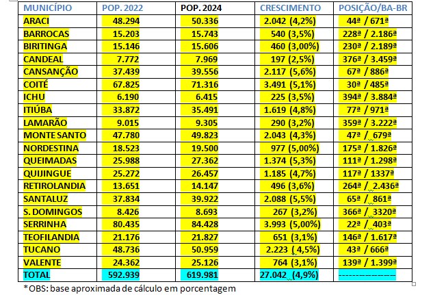 O CN fez o levantamento também da população dos outros 19 municípios do referido território que tem Serrinha (84.428) como o mais populoso e Ichu (6.415) com a menor população.