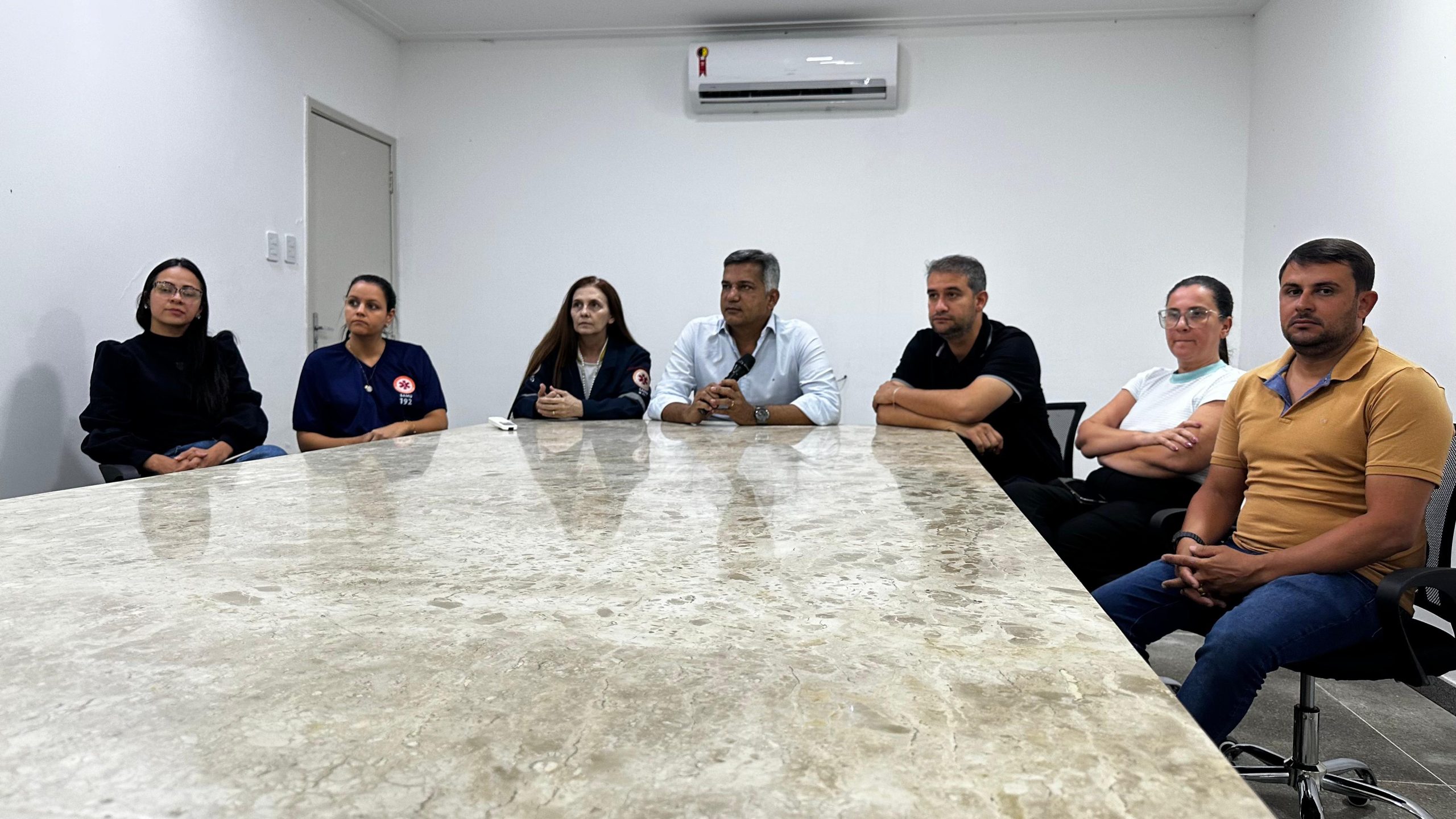 vice-prefeito Felipe Sales, coordenadora regional do SAMU Maisa Macedo, secretário municipal de Saúde Filipe Alexandre, sub secretária de Saúde Jamile de Paula, diretora presidente do FUSAS Heloísa Guimarães e a gerente local do SAMU Caroline Mascarenhas.