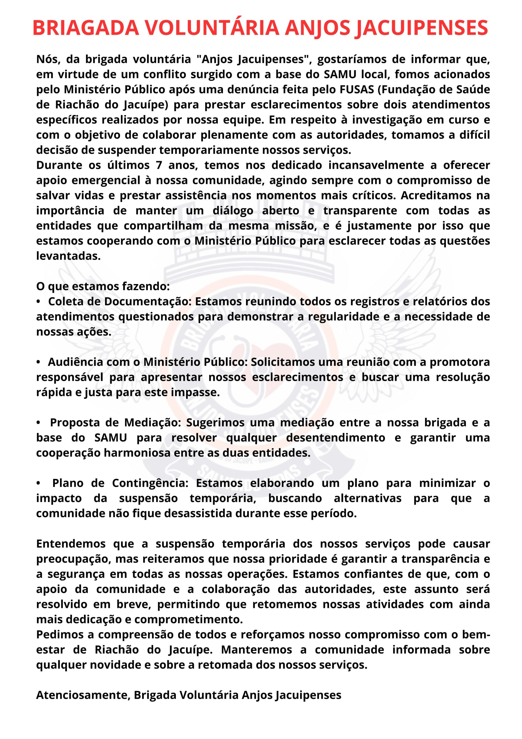 A semana em Riachão do Jacuípe começa com certa tensão, após a Diretoria da Brigada Voluntária Anjos Jacuipenses anunciar de forma inesperada a suspensão das atividades por tem indeterminado. Veja abaixo
