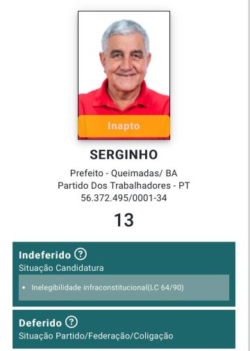 Com a decisão, Serginho já consta como inapto no sistema do TSE, porém, como foi uma decisão de primeira instância o candidato pode recorrer junto ao Tribunal Regional Eleitoral (TRE-BA).