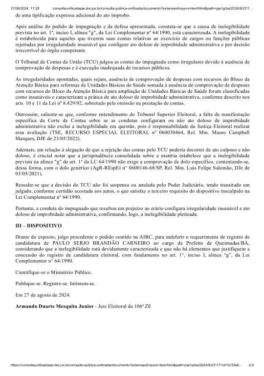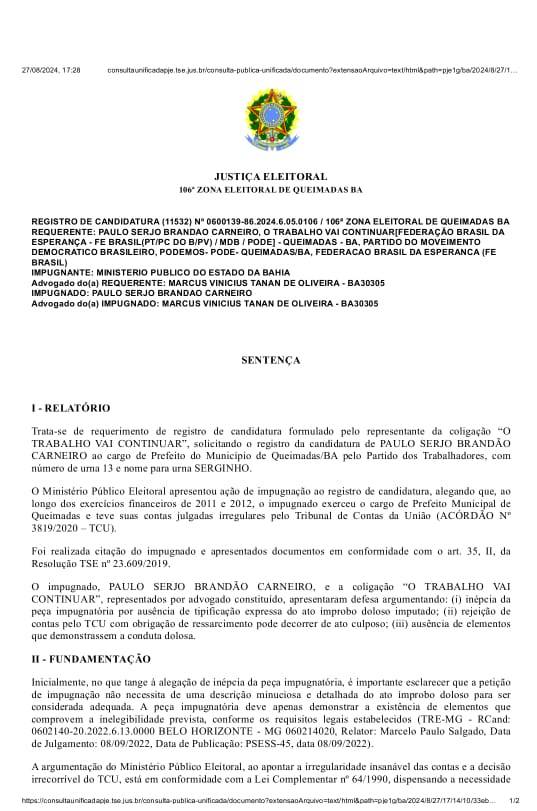 A frustração ocorreu quando no fim da tarde desta terça-feira, 27, o juiz da 106ª Zona Eleitoral acatou o pedido do Ministério Público Eleitoral (MPE-BA) decidiu pela impugnação do registro de candidatura de Serginho. O MPE apresentou ação de impugnação alegando que, ao longo dos exercícios financeiros de 2011 e 2012, o impugnado exerceu o cargo de prefeito do município de Queimadas e teve suas contas julgadas irregulares pelo Tribunal de Contas da União (TCU).