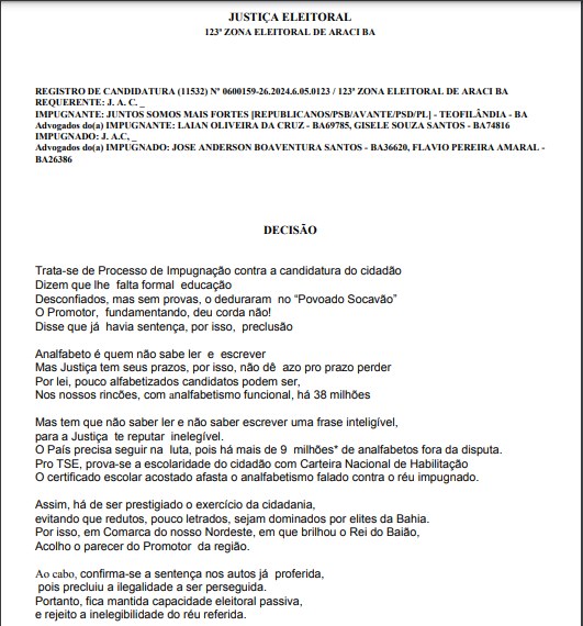 Os partidos impugnaram a candidatura ao questionar os “critérios adotados para avaliar a capacidade eleitoral passiva” do candidato. No entanto, ele apresentou declaração de escolaridade, comprovando que concluiu a 4ª série do ensino fundamental, em Socavão (BA).