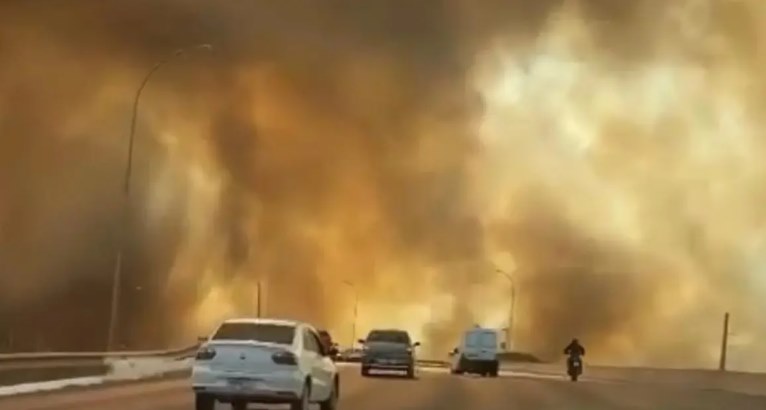 Uma motorista que trafegava no viaduto Ayrton Senna, em Brasília, publicou um vídeo que mostra o cenário dos incêndios de grandes proporções que atingem a capital federal. De acordo com as informações, as chamas que aparecem nas imagens tomaram conta de uma região de mata atrás da antiga Rodoferroviária.