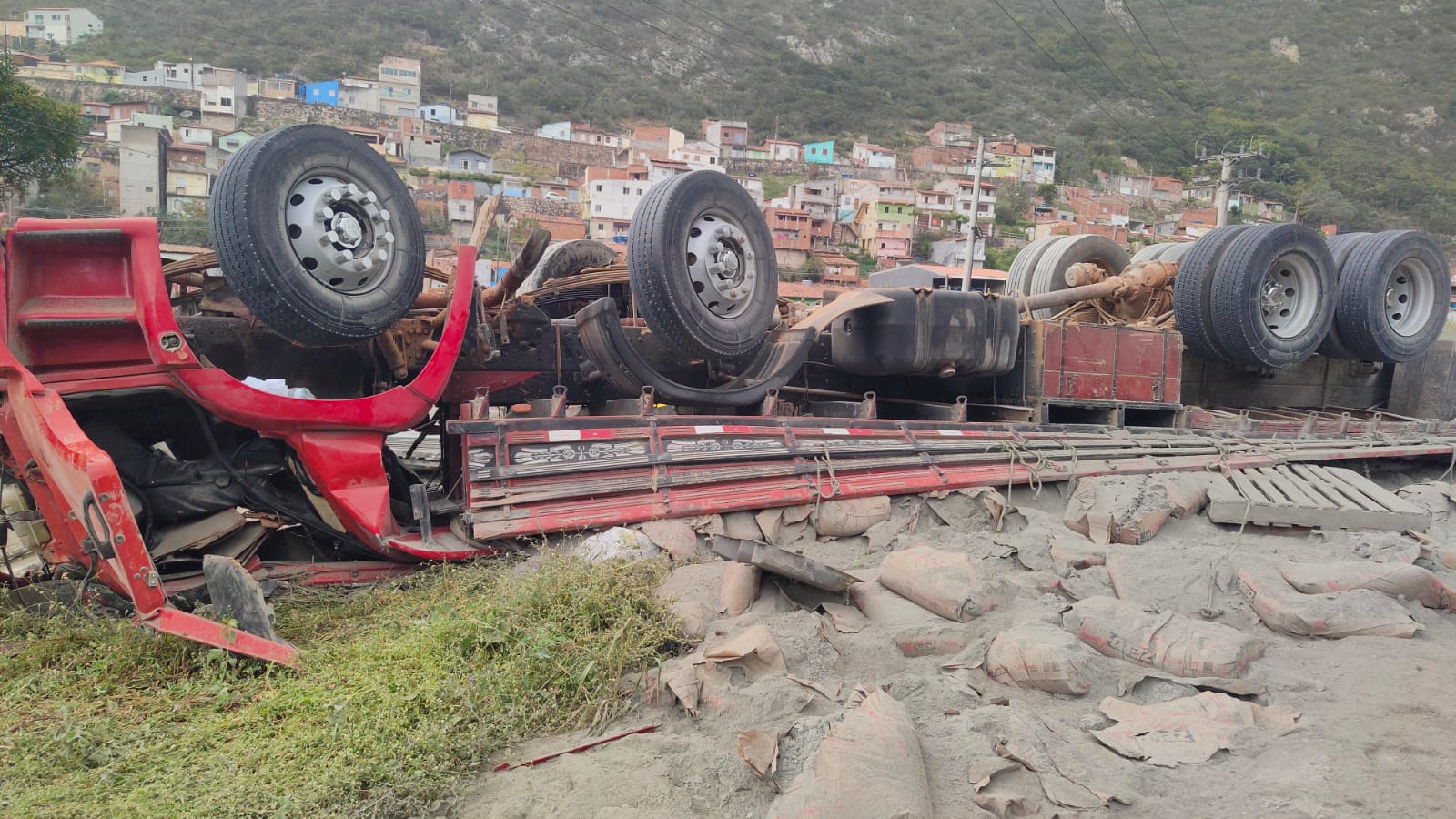No início da manhã desta terça-feira, 24, um caminhão carregado com cimento captou na BR 324, altura do Bairro da Grotinha, no perímetro urbano da cidade de Jacobina, saída para Capim Grosso, porém o capotamento aconteceu no sentido oposto, ou seja, na chegada de Jacobina, já que a carga seria entregue na cidade de Irecê, distante 200 km de Jacobina.