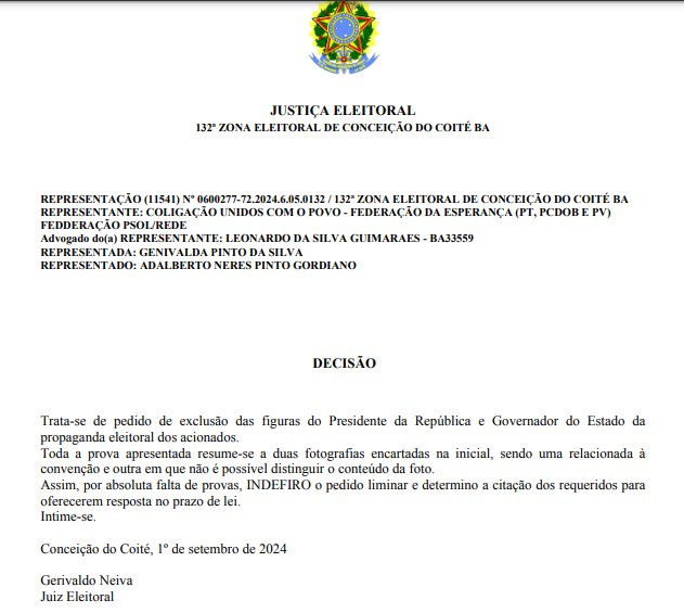 A Justiça da 132ª Zona Eleitoral de Conceição do Coité indeferiu, o pedido de exclusão das imagens do presidente Lula e governador Jerônimo Rodrigues, da campanha eleitoral da candidata do PSD à prefeitura, Val.