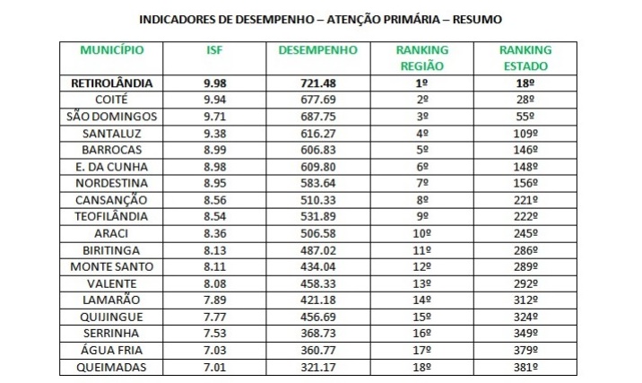O município de Retirolândia no território do sisal se consolidou-se como referência na atenção primária da saúde 2024. Com nota 9,98, ocupa o 1º lugar entre os 18 que compõem o Consórcio de Saúde da região do Sisal e 18º no ranking Estadual entre os 417 municípios.