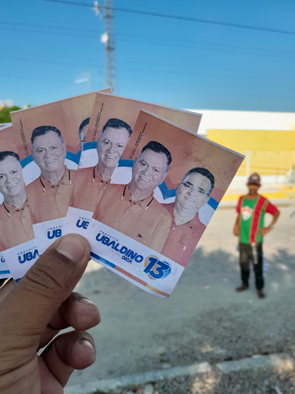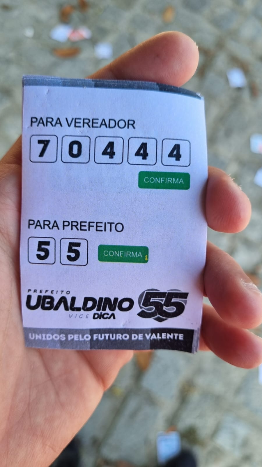 Foram encontrados vários santinhos com a foto de Ubaldino Amaral que concorre a reeleição pelo Avante, ao lado do vice Dica que é filiado ao PT, com o pedido de votar no 13.