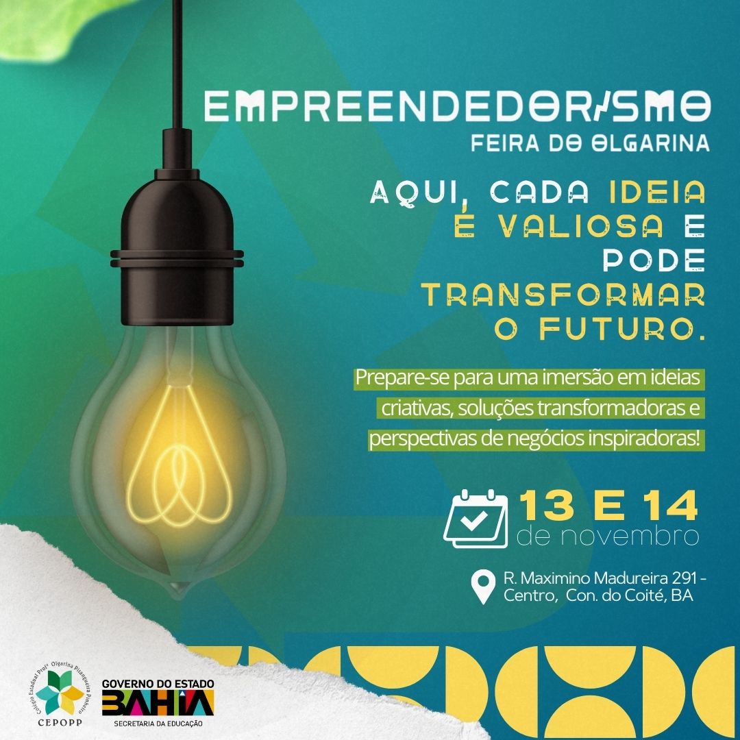 O Colégio Estadual Olgarina Pitangueira Pinheiro (CEPOPP) realiza nesta quarta e quinta-feira, dias 13 e 14, a 3ª Edição da FESSTE – Feira de Empreendedorismo Social, sustentável e tecnológica no município de Conceição do Coite. Esse ano a feira trás uma imersão com projetos que unem inovação e impacto social, com temas como agricultura familiar, reaproveitamento de alimentos, inteligência artificial, jogos on-line e muito mais.