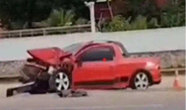 De acordo com informações iniciais, o veículo Saveiro colidiu frontalmente com o ônibus, causando a morte do condutor da picape, identificado pelo prenome Fabrício. A vítima não resistiu ao impacto e faleceu no local.