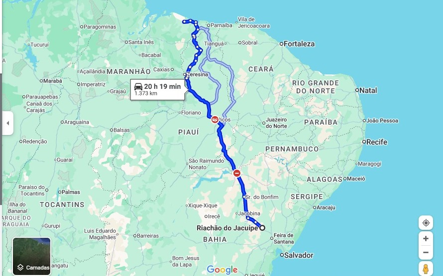 No mapa abaixo mostra a distância entre Riachão e Barreirinhas (1.373 km) e tempo de viagem estimado de 20h19 min.