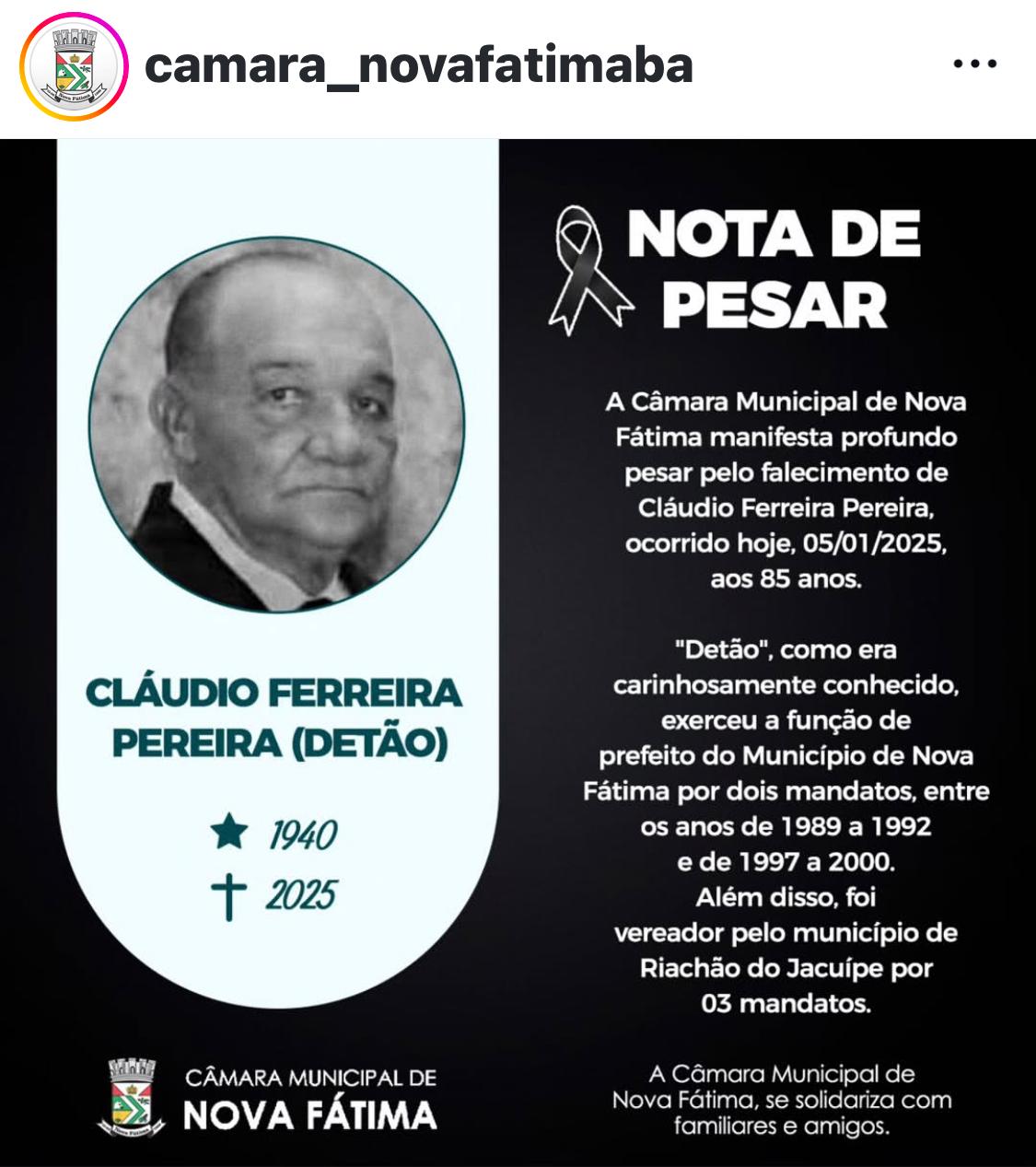 O Município de Nova Fátima no território da Bacia do Jacuípe está em luto. Morreu na manhã deste domingo, 05, aos 84 anos, Claudio Ferreira Pereira, popularmente conhecido por Detão, primeiro prefeito do município.