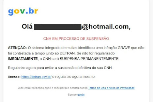 Os motoristas recebem mensagens, geralmente via SMS ou e-mail, informando que sua CNH está prestes a ser suspensa devido a uma multa. A mensagem inclui um link que redireciona a vítima para um site falso, projetado para imitar a Carteira Digital de Trânsito e o portal oficial do gov.br.