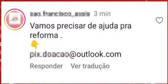 Segundo o frei Lorrane Clementino, um perfil que tem um nome parecido com o da igreja foi flagrado comentando em postagens sobre o acidente, forjando pedidos de doação. Um print feito pela Ordem Primeira de São Francisco mostra a ação.