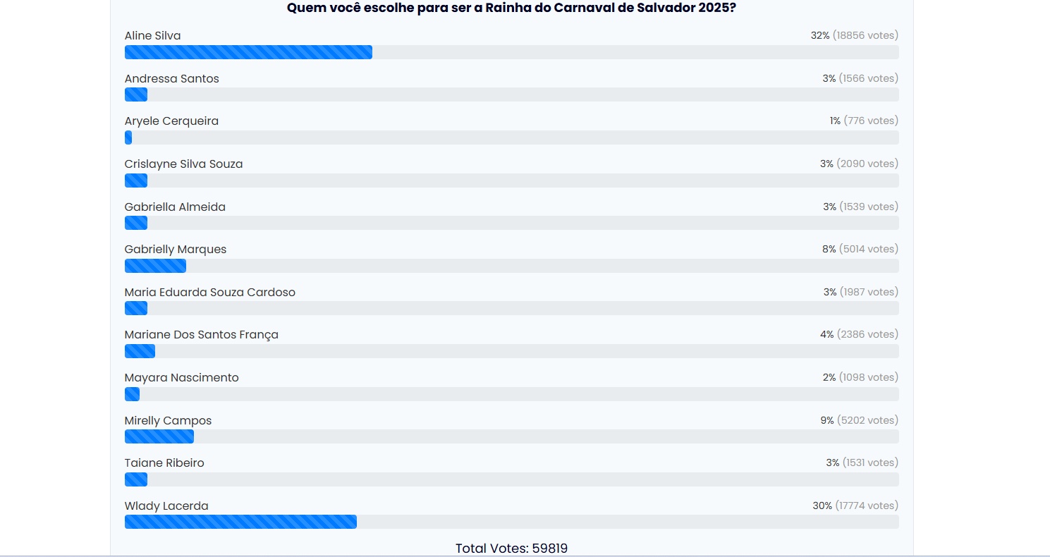 Crislayne eleita a Rainha, não foi bem votada na enquete, recebeu apenas 2.090 votos (3%), Mariane França, eleita a Segunda Princesa, também não teve boa votação na enquete, 2.386 (4%).