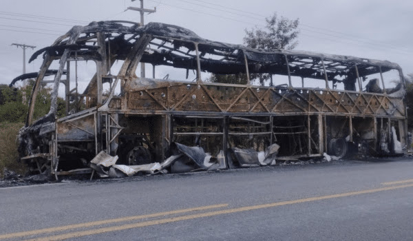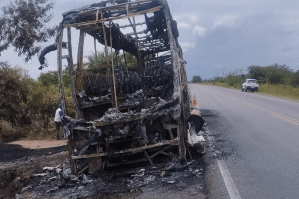 Um ônibus da empresa Novo Horizonte, que trafegava pela BR-324, na noite de sábado, 1º, pegou fogo entre os distrito Itatiaia município de São José do Jacuípe e o Povoado Peixe, em Capim Grosso.