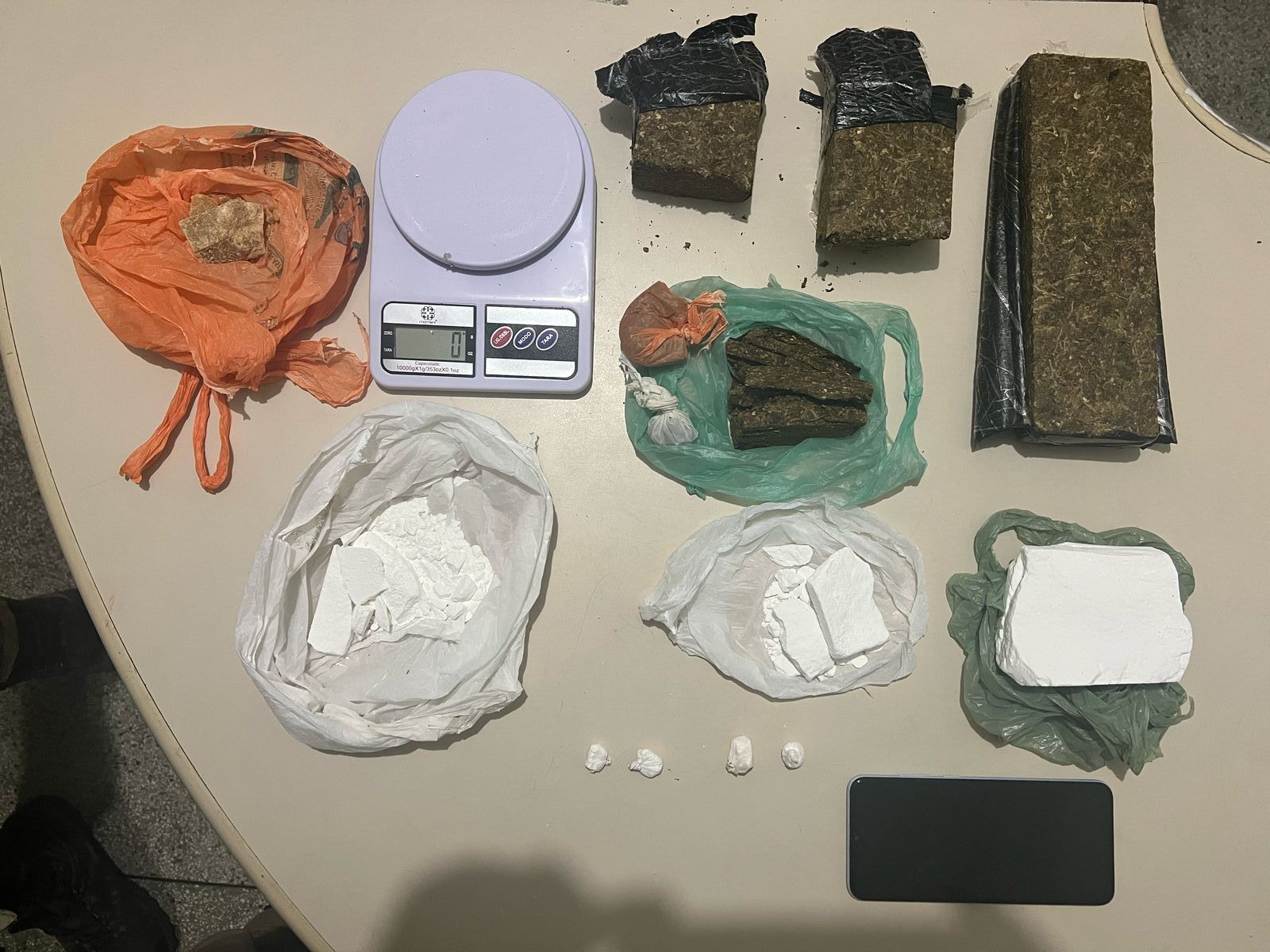 Durante a abordagem, foram encontradas quatro trouxinhas de cocaína e na residência do suspeito, local da denuncia, foram apreendidos cerca de 1 quilo de maconha, 313 gramas de cocaína, 42 gramas de crack e uma balança de precisão usada para dividir o material.