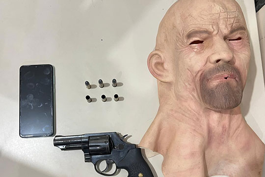 Com o individuo morto a polícia encontrou revólver calibre 38 com numeração suprimida e uma máscara de silicone com aparência de rosto humano