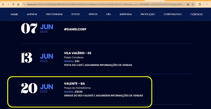 A Prefeitura de Valente, localizada no território do Sisal, anunciou oficialmente a Banda Magníficos como a primeira atração confirmada para o Arraiá do Boi Valente, que ocorrerá de 20 a 23 de junho. Curiosamente, o nome do cantor Daniel não foi mencionado nos canais oficiais da prefeitura. No entanto, a agenda oficial do artista indica uma apresentação no evento no dia 20 de junho, primeiro dia da festa.
