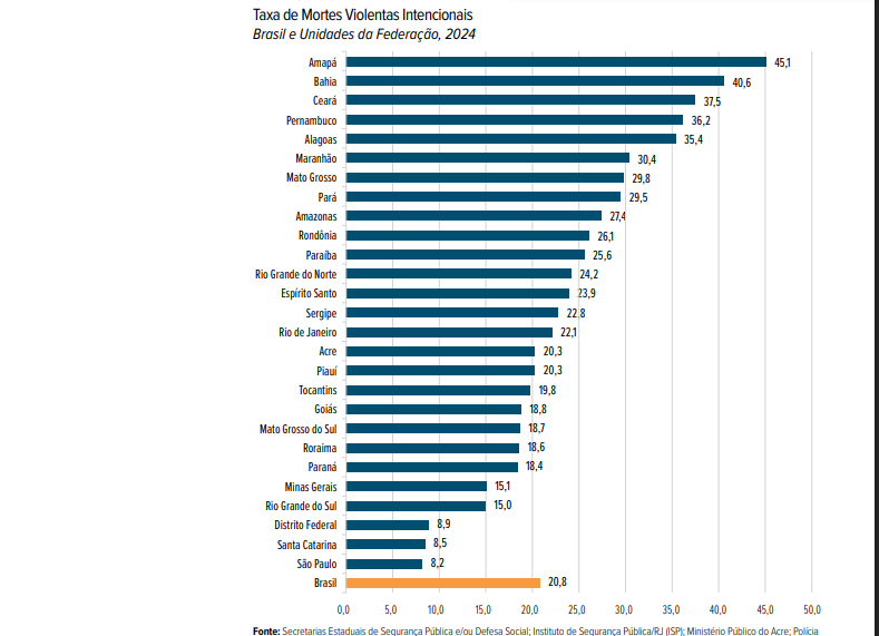 A Bahia obteve a segunda maior taxa de mortes violentas intencionais (MVI) no ano passado. O estado registrou 40,6 mortes por 100 mil habitantes durante 2024, segundo dados do Anuário da Violência 2025. No levantamento acessado pela reportagem do Bahia Notícias, parceiro do Calila, o território baiano ficou atrás somente do Amapá, que notificou uma taxa de 45,1 por 100 mil habitantes.