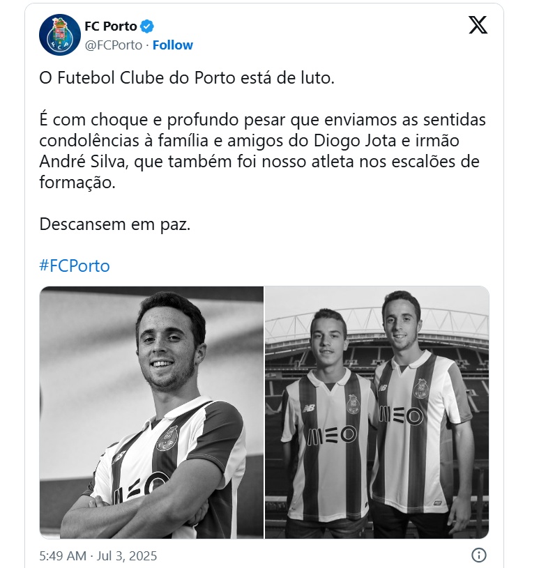 O Porto, clube onde Diogo Jota começou a ganhar destaque internacional, se solidarizou com a família e amigos do jogador.