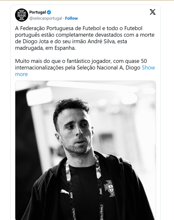 O perfil da seleção de Portugal também se manifestou sobre a morte de Diogo Jota e seu irmão André Silva.