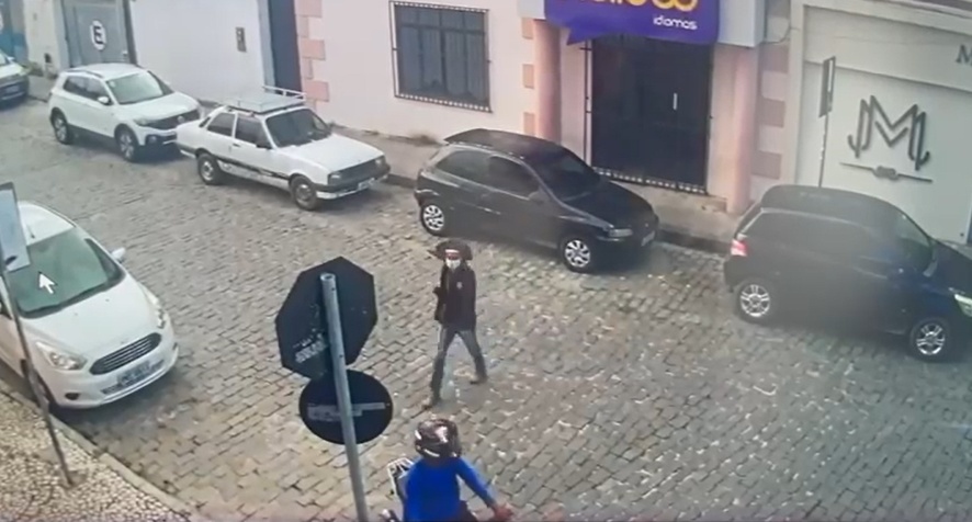 O primeiro registro, feito às 11h22, mostra um carro preto estacionando em uma esquina nos fundos do antigo Colégio Antônio Bahia. Logo depois, uma motocicleta com um dos suspeitos chega ao local e aguarda a aproximação de um terceiro homem que desce do carro vestindo jaqueta de manga longa, chapéu camuflado e máscara facial semelhante às usadas durante a pandemia. Eles seguem juntos em direção à Praça da Babilônia.
