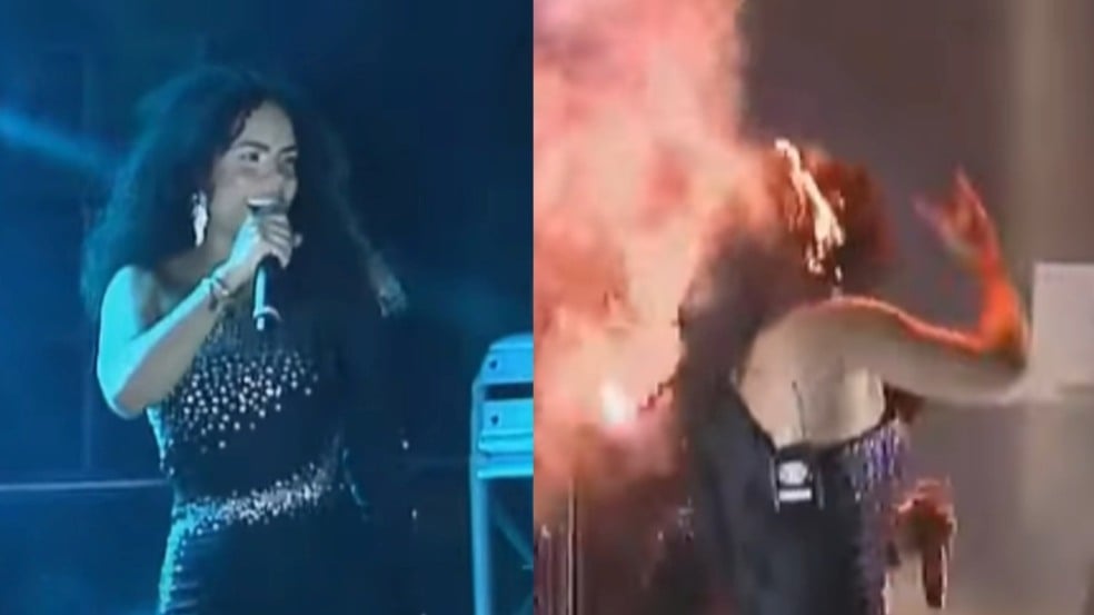 A backing vocal da banda de forró Limão com Mel, Nathy Souza, passou por um susto no último domingo (27). Ela teve o cabelo atingido pelo fogo do efeito pirotécnico. O caso ocorreu durante um show na cidade de Salgueiro, em Pernambuco.