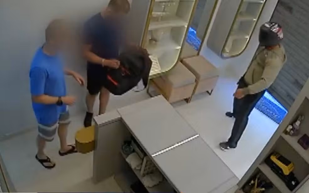 O crime aconteceu por volta das 8h, logo depois que a loja foi aberta. As câmeras de segurança registraram a ação dos dois suspeitos: eles entraram no estabelecimento de capacete e, em seguida, fecharam a entrada para não chamar a atenção de pedestres.