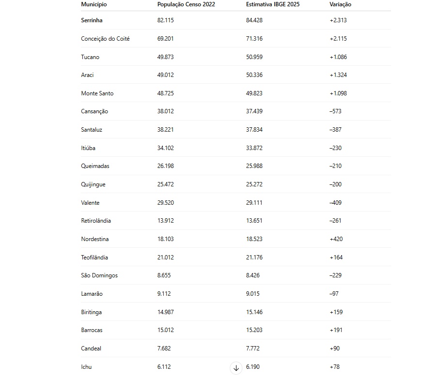 O Território do Sisal apresenta uma dinâmica populacional desigual, segundo levantamento do Calila Notícias com base nos dados do Censo 2022 e nas estimativas populacionais de 2025, divulgadas pelo IBGE nesta quinta-feira (28). O CN fez um comparativo não seguido o apresentando pelo IBGE que foi de um ano, e sim de 3 anos conforme tabela abaixo. O comparativo de um ano o destaque na região fica para Nordestina que ao lado de Luiz Eduardo conseguiu superar 1% de aumento populacional.