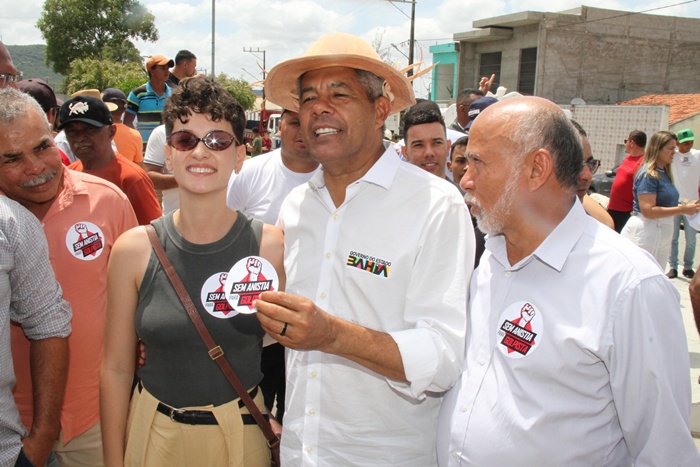Antes do ato oficial, ainda na praça, o governador da Bahia, Jerônimo Rodrigues (PT), fez questão de posar com um adesivo com a frase “Sem anistia para o golpista”. Ele não chegou a fixá-lo na roupa, mas exibiu o adesivo na mão, em gesto de apoio simbólico, e reforçou sua posição: