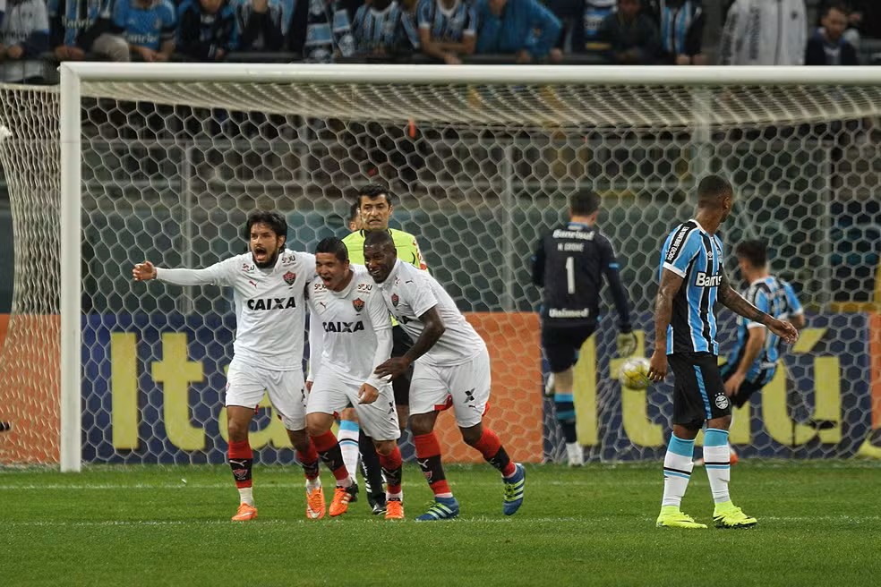 Para lembrar a última vez que o Vitória bateu o Grêmio, é preciso voltar a 2016, quando o Rubro-Negro venceu por 2 a 1, fora de casa. Na ocasião, o Leão abriu o placar com gols de Kieza e Diego Renan, e o Tricolor diminuiu com um gol contra de Victor Ramos.