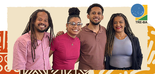 Pra todos verem: quatro pessoas negras estão lado a lado, sorrindo e posando para a foto. Da esquerda para a direita: a primeira pessoa veste uma camisa rosa de mangas longas; a segunda usa blusa rosa de manga curta e óculos, com o cabelo preso em um coque; a terceira veste uma camisa polo marrom; a quarta usa blazer preto sobre blusa cinza e batom vermelho. No canto superior direito, o logotipo do TRE-BA.