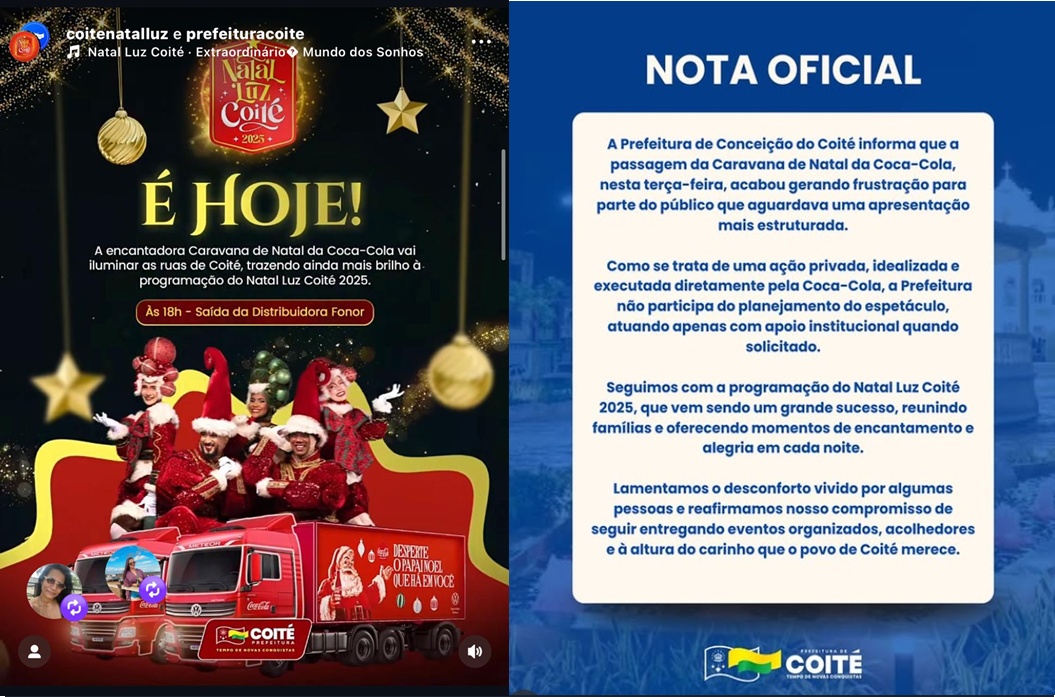 Na nota, a Prefeitura também reforçou que segue com a programação do Natal Luz Coité 2025, destacando que os demais eventos vêm sendo bem avaliados e contaram com grande presença de famílias. Mesmo assim, o episódio da caravana permanece como um dos temas mais comentados entre moradores, que esperavam um desfile mais marcante e organizado.