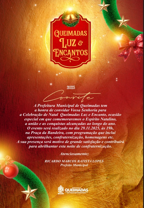 A celebração, intitulada Natal Luz e Encanto, contará com o acendimento das luzes natalinas, apresentações especiais, homenagens e confraternização. A festa marca oficialmente a entrada de Queimadas na programação de fim de ano — um marco que passa a integrar o calendário municipal.