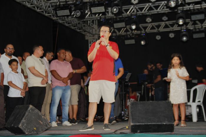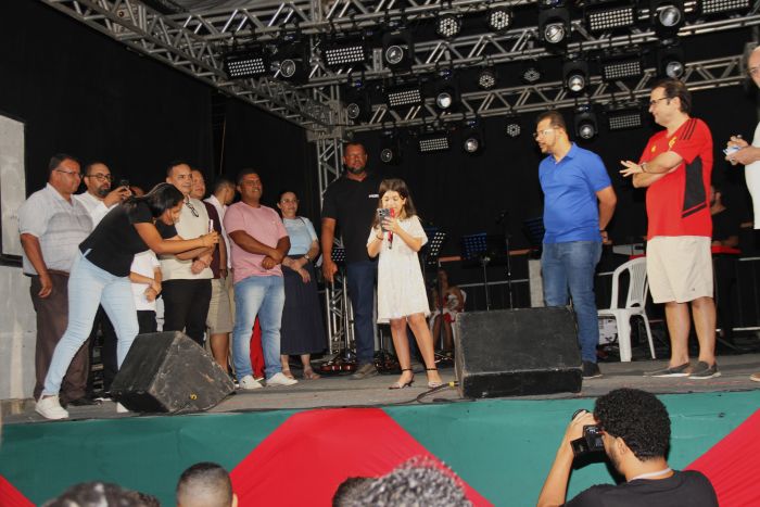 Ato no palanque começou com mensagem da pequena Júlia Raíssa, filha do prefeito