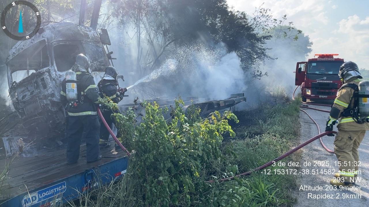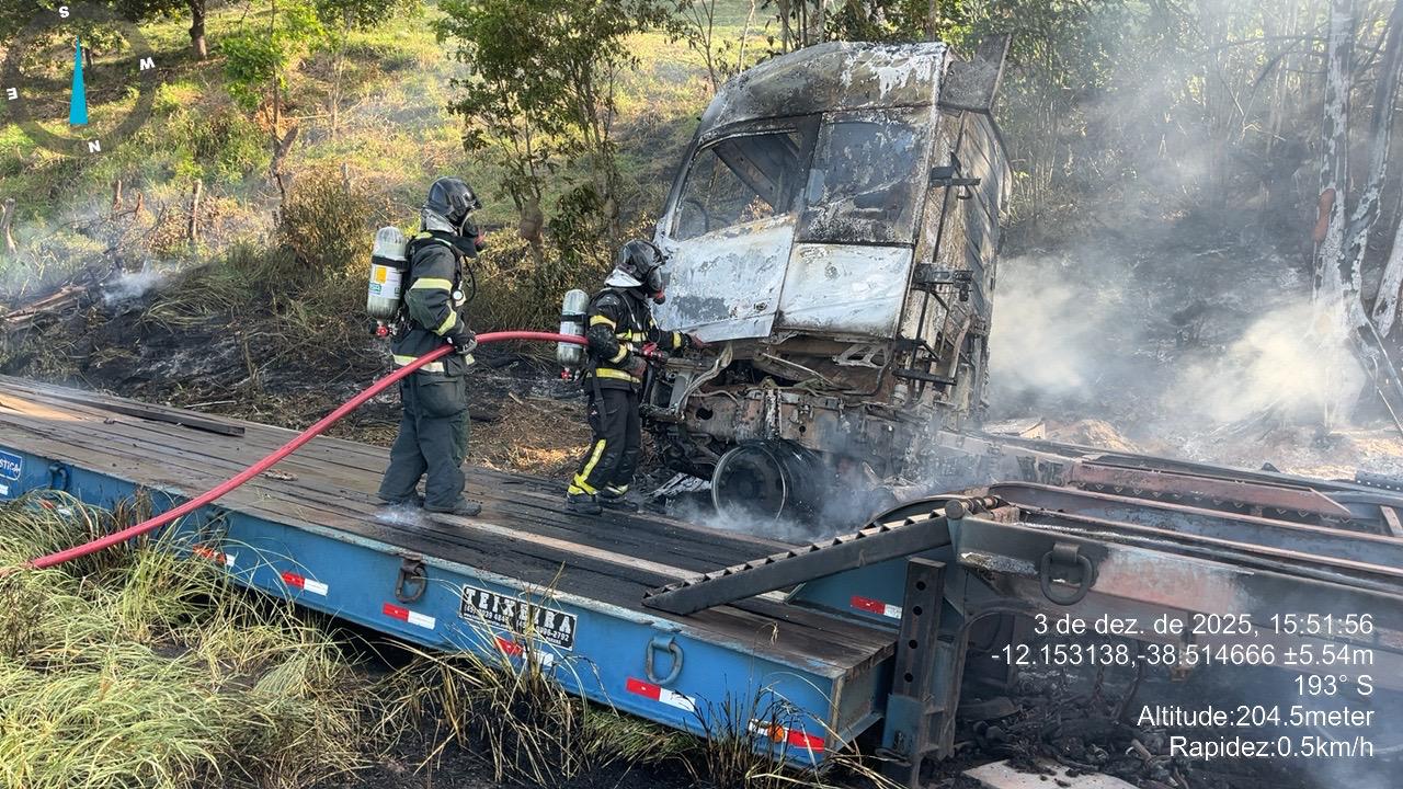 Segundo relato do Grupamento de Bombeiro Militar, o caminhão Volvo FH 460, acoplado a uma prancha de três eixos, seguia no sentido Alagoinhas–Feira de Santana, com destino final ao município de Pouso Alegre (MG). Após o travamento da roda, o veículo desceu uma ribanceira e parou em posição de “L”, momento em que o fogo teve início na área afetada pela pane, conforme informou o próprio motorista.