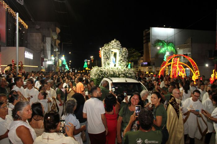 A cerimônia religiosa, marcada por cânticos, homenagens e intensa participação dos fiéis, reforçou a devoção da comunidade à sua padroeira. Após a missa, a multidão seguiu em procissão pelas principais vias da cidade — Avenida Getúlio Vargas e Centro Comercial — retornando em seguida à Igreja Matriz, onde ocorreu a Adoração ao Santíssimo, momento de grande emoção e recolhimento espiritual.