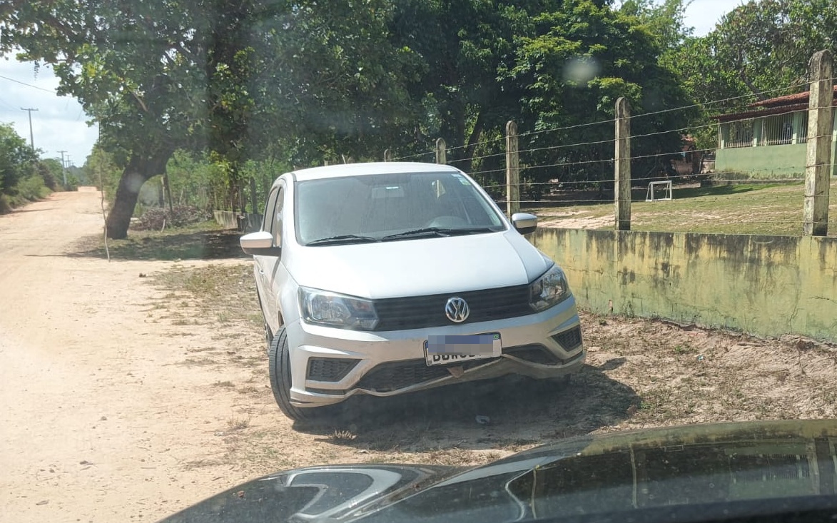 Outro fator que chama atenção é que, pela forma como o carro está estacionado, quem passa pela estrada pode imaginar que o veículo pertença a algum morador da comunidade, já que a pista permanece livre para o tráfego.