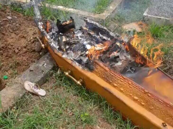 Segundo informações, criminosos teriam invadido o cemitério municipal logo após o sepultamento de um homem e ateado fogo no caixão onde o corpo estava enterrado.