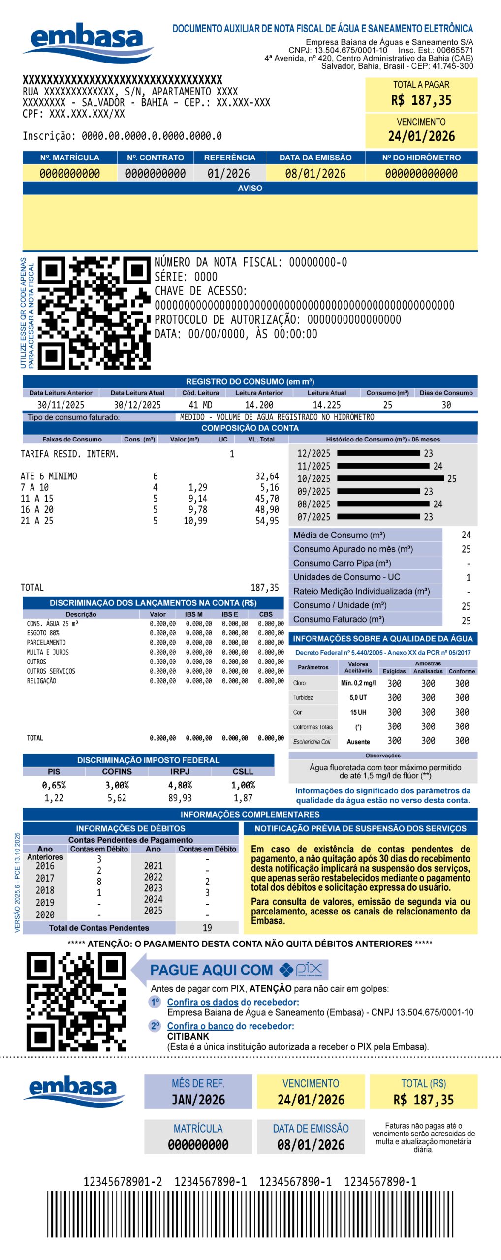Já o QR Code para pagamento via PIX continua presente na parte inferior da fatura, acompanhado de informações adicionais, como o CNPJ da Embasa (13.504.675/0001-10) e o banco recebedor (Citibank), o que ajuda o cliente a se proteger contra golpes. Antes de pagar, é sempre importante que o cliente confira essas informações.