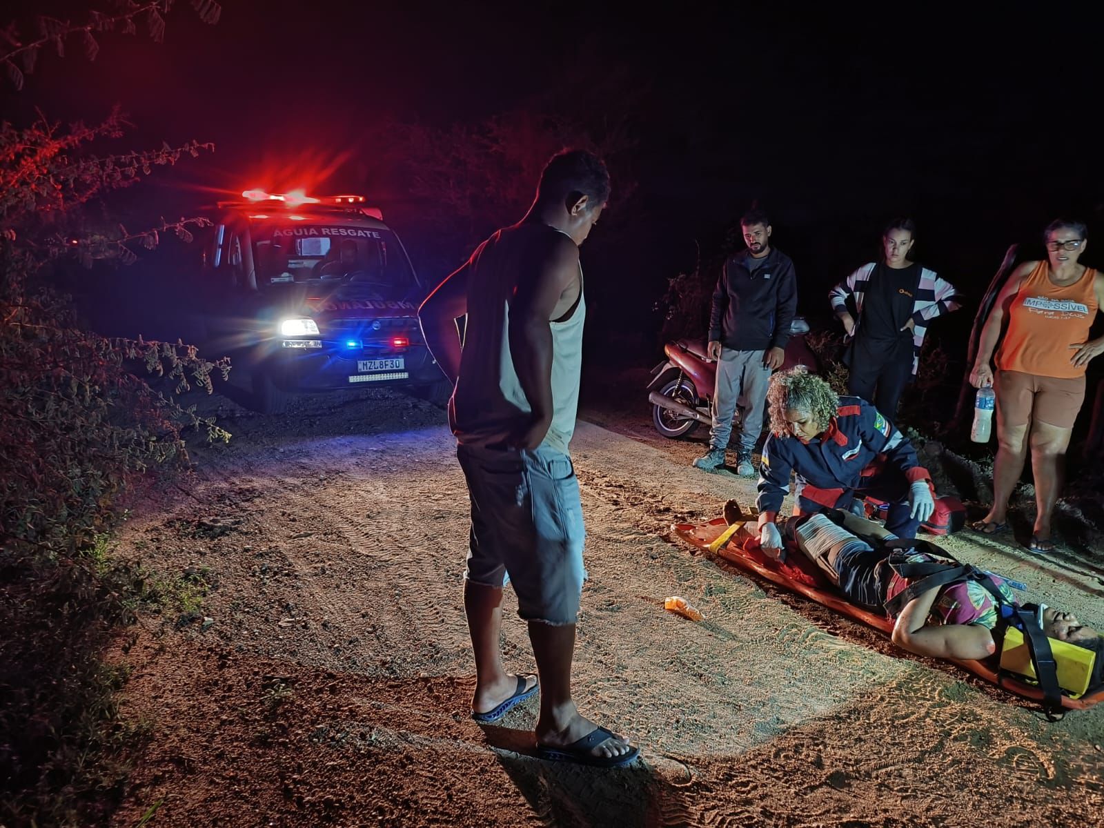Antes da solicitação para atender o estudante vítima do escorpião, a equipe de socorristas voluntários da Brigada Aguia Resgate foi acionada para atender a uma vítima de acidente de moto na região do Açude de Aroeira. Uma mulher pilotava uma motocicleta quando perdeu o controle ao passar em uma levada [espécie de bica feita pela água da chuva].