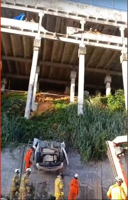 Imagens que circulam nas redes sociais mostram o carro pendurado sobre um muro, após a queda.