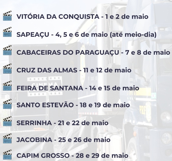 A Carreta do Cinema Rodoviário da Polícia Rodoviária Federal está com nova agenda na Bahia dentro das ações do movimento Maio Amarelo 2026, contemplando inclusive municípios dos territórios do Sisal e da Bacia do Jacuípe com sessões gratuitas de educação no trânsito.