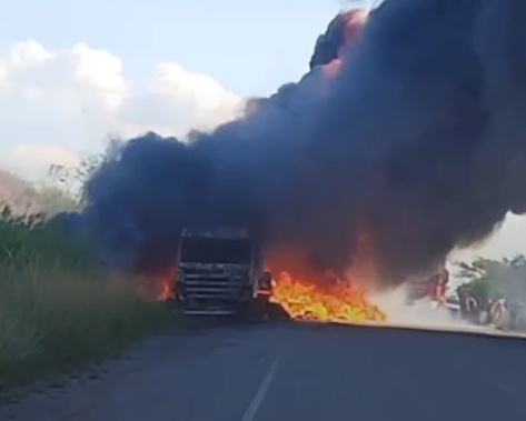 Uma carreta modelo Scania foi atingida por um incêndio na tarde desta sexta-feira (17), por volta das 15h30, na BR-110, nas proximidades da localidade conhecida como Zé do Bode, em Ribeira do Pombal.