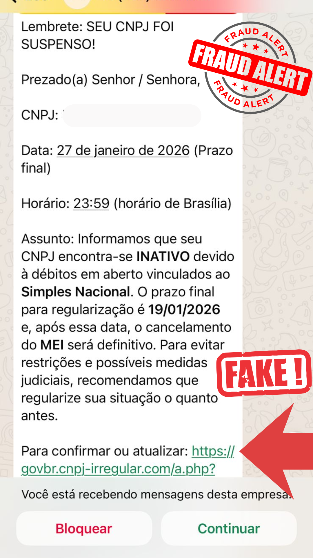 De acordo com o comunicado, empresários estão recebendo mensagens por WhatsApp, SMS e e-mail informando que o CNPJ estaria suspenso, inapto ou irregular. As mensagens, segundo a contabilidade, costumam vir acompanhadas de links que prometem “regularização imediata”, induzindo o usuário ao erro.